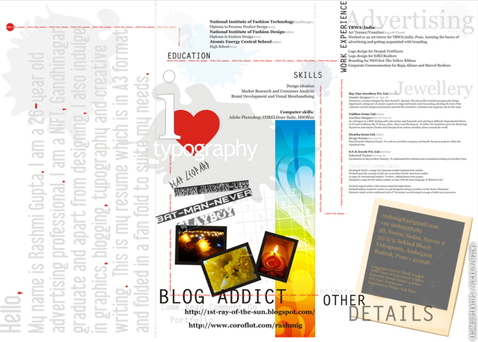 The term infographicsimply refers to presenting information in a visual way. Over the past decade, and especially in recent years, it’s become trendy for people in the creative arts/design industry to highlight their career achievements using infographics. Multifunctional and attention-grabbing, an infographic resume serves as a working model, exhibiting its creator’s design skills and personality, whilst also providing recruiters with a snap shot of their education and work history.